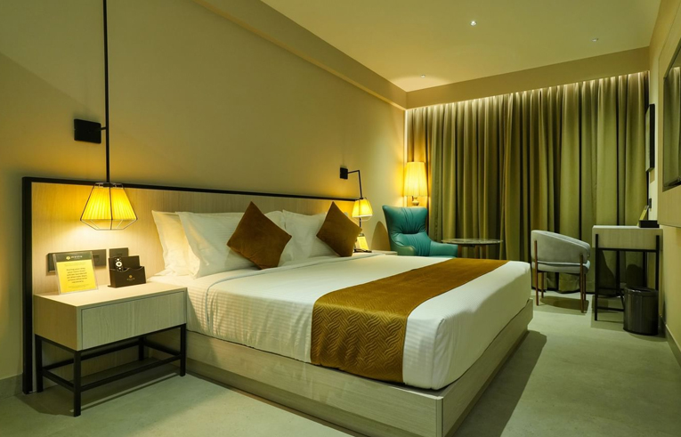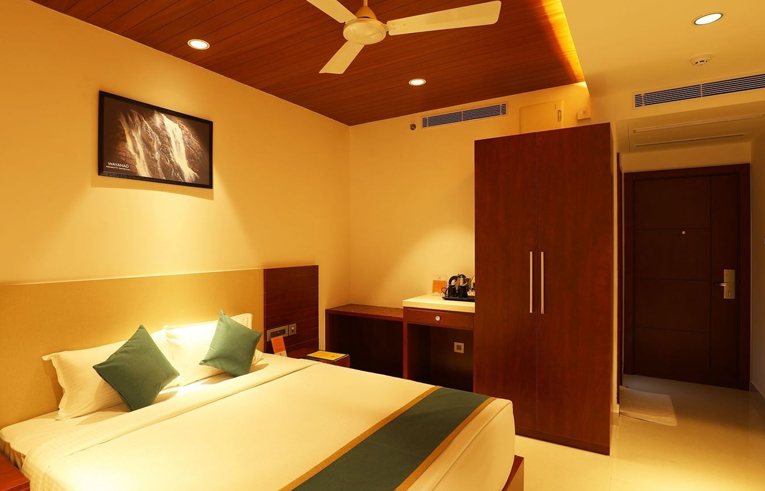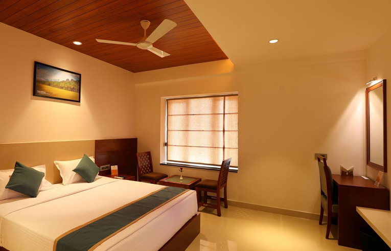 Step into our Blossom Room in Wayanad, a spacious 230-sq. ft. haven designed for up to two adults and one child. We can accommodate an additional adult with an extra mattress available for an additional charge. Here, every detail from the airy ambience to the tasteful decor invites you to unwind in elegance. Enjoy the comfort of a 10-inch pocketed spring mattress, indulge in our minibar offerings, and savour the thoughtfully provided toiletries. It’s not just a stay but an experience wrapped in serenity and charm, perfect for making lasting memories.