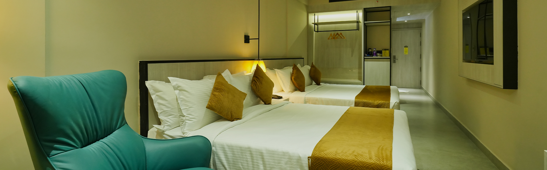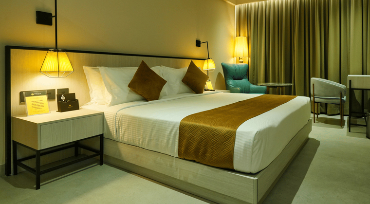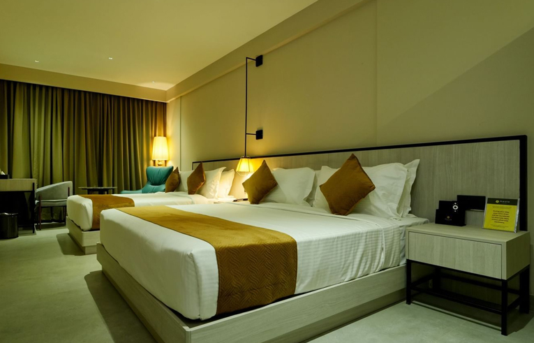 The 300-sq. ft. Opus Family Room in Wayanad is designed for up to five adults and one child. We can accommodate an additional adult with an extra mattress available for an additional charge. This spacious and inviting retreat combines comfort, style, and convenience, ensuring everyone feels right at home. Featuring both a queen size and a king size bed, the room provides ample space for parents and kids to unwind. With premium mattresses, crisp linens, and plush pillows, along with a suite of modern amenities, your family's stay will be as relaxing as it is memorable.